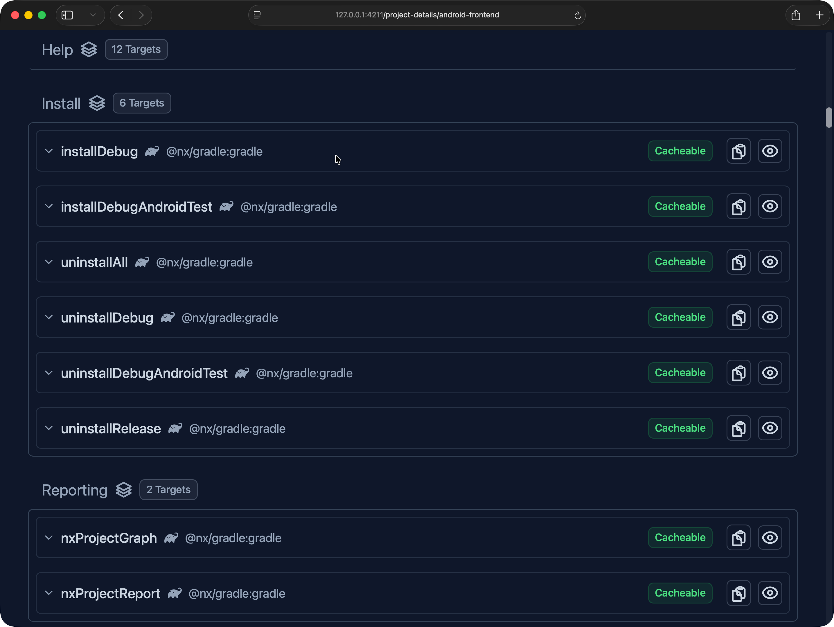 1plugins { 2+ id("dev.nx.gradle.project-graph") version "0.1.0" 3 alias(libs.plugins.android.application) 4 alias(libs.plugins.kotlin.android) 5 alias(libs.plugins.kotlin.compose) 6} 7 8android {...} 9dependencies {...} 10 11+ allprojects { 12+ apply { 13+ plugin("dev.nx.gradle.project-graph") 14+ } 15+ } 16